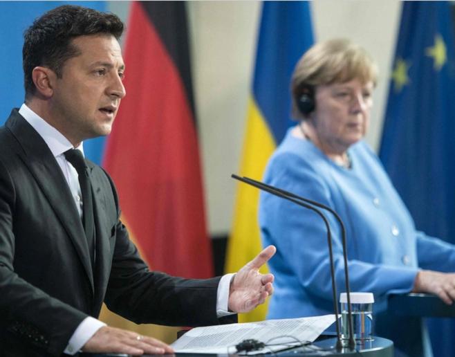 Cựu Thủ tướng Đức Angela Merkel và Tổng thống Ukraine Volodymyr Zelensky. Ảnh: New York Times.