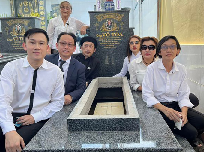 Hoài Linh mặc áo dài khăn đóng cùng mẹ và các anh chị em khác trong gia đình chụp ảnh bên mộ phần bố anh. Ngày 6/4, gia đình nghệ sĩ hài tề tựu đông đủ làm lễ đưa tro cốt ông Võ Toà về yên nghỉ bên cạnh ông bà, tổ tiên ở một nghĩa trang tại Dầu Giây, Đồng Nai.