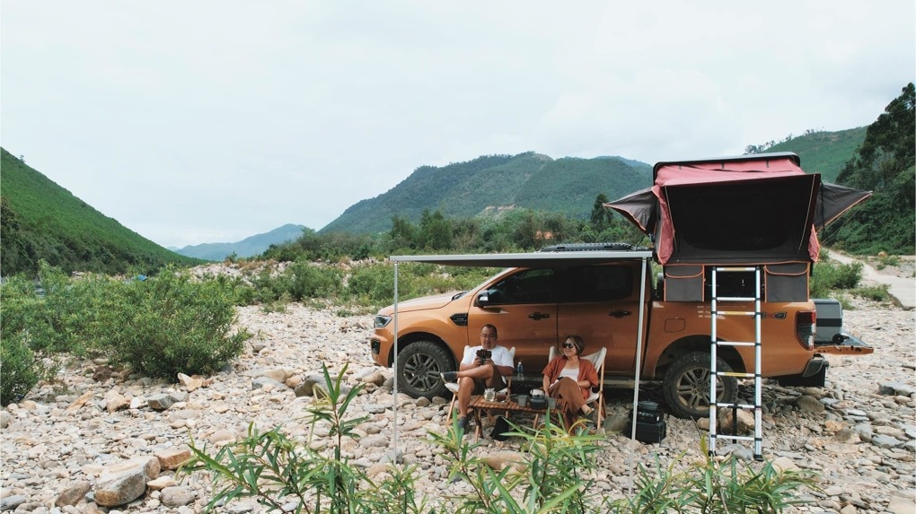 Vì du lịch sau Covid-19, nhiều điểm đến khác dường như chỉ có hai người. Lần đến Mũi Trèo, Quảng Trị, họ phải qua con đường nhỏ giữa rừng như đã lâu không khách qua lại, cây cối mọc um tùm làm cụp gương xe. Họ cắm trại bên rìa núi hoang sơ, ngắm biển xanh rì, tận hưởng không khí trong lành và vắng vẻ.