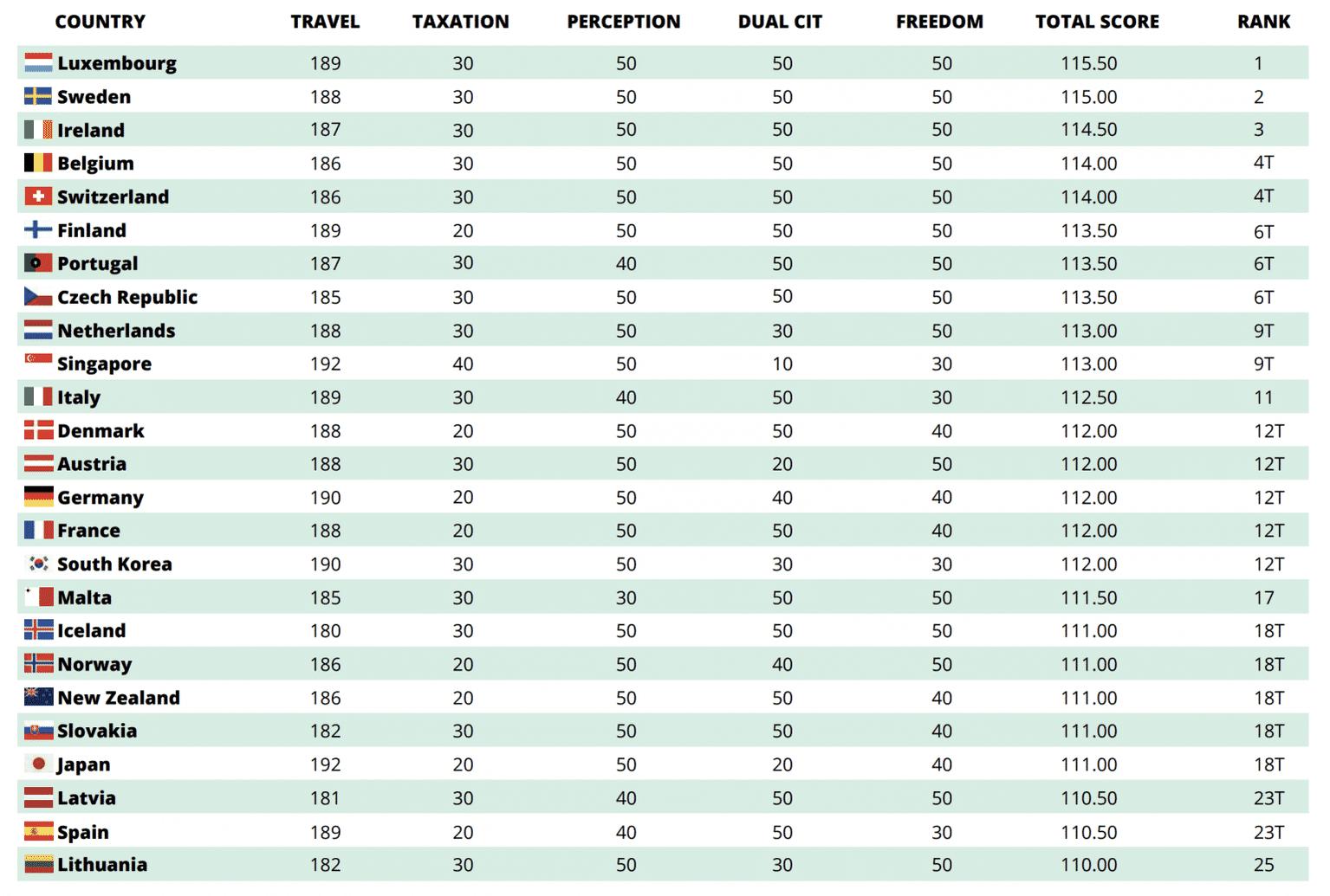 10 thứ hạng hàng đầu của năm nay cũng giống như năm ngoái với 9 nước đến từ châu Âu. Khác biệt nửa điểm giữa vị trí số 1 Luxembourg và vị trí số 2 Thụy Điển là vì Luxembourg “có thị thực nhiều hơn một nước”.