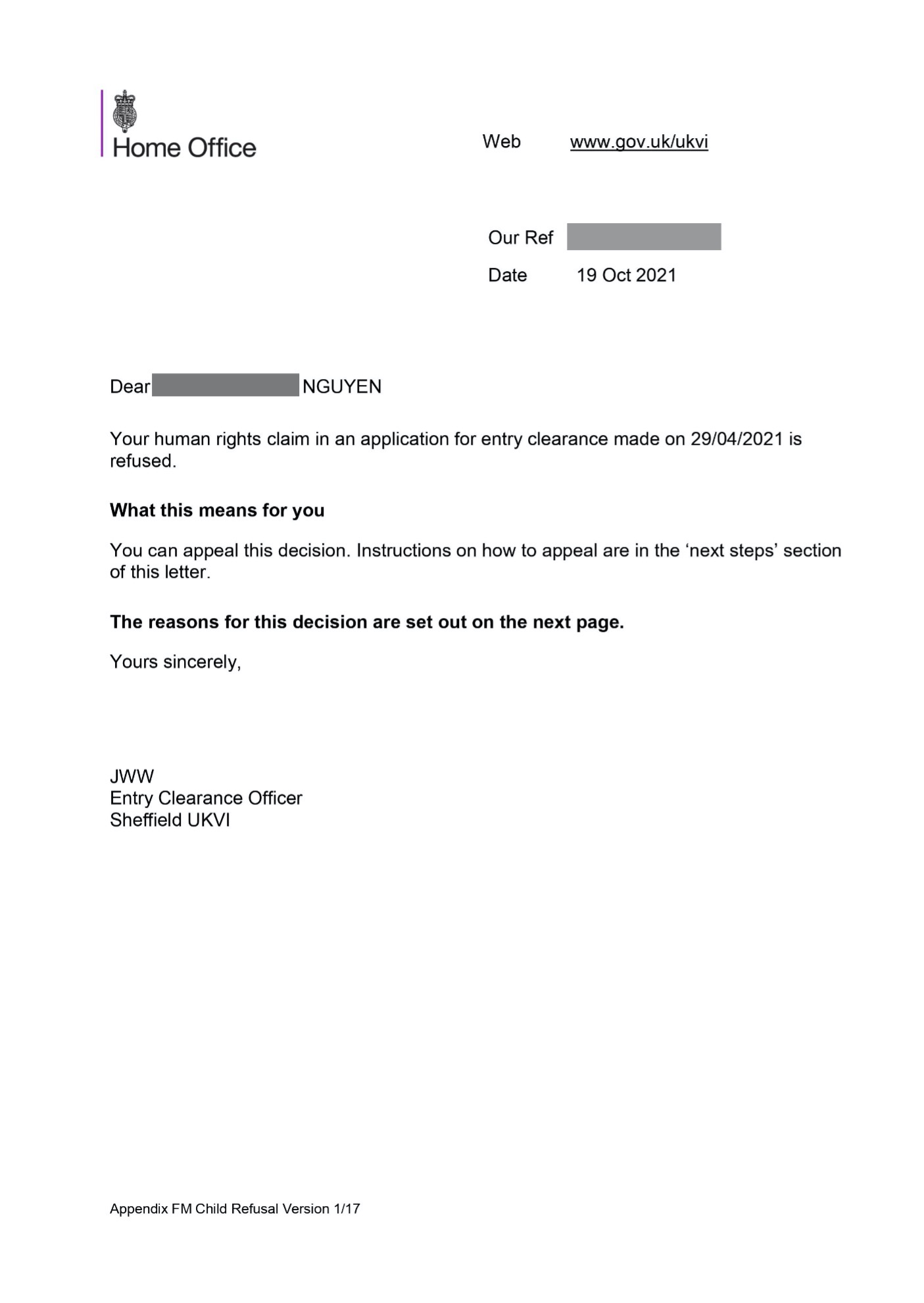 Trong lần đầu nộp hồ sơ, rất không may N.T đã bị từ chối visa đoàn tụ với mẹ tại UK bởi HO hiểu nhằm rằng T ở Việt Nam vẫn đang có người chăm sóc và nuôi dưỡng em nhưng sự thực mẹ em đang sinh sống tại Anh quốc và bố em hiện cũng đang sinh sống tại một quốc gia khác.