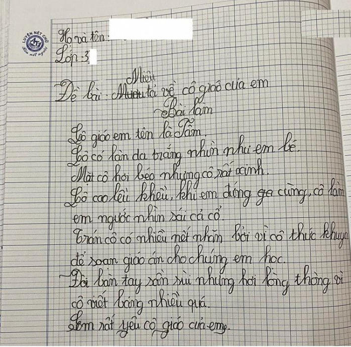 Một bài văn tả về cô giáo của học sinh lớp 3 lại tiếp tục "chiếm sóng" mạng xã hội. Dân tình phải cười ngặt nghẽo trước những câu chữ ngây thơ và hồn nhiên của em học sinh này.