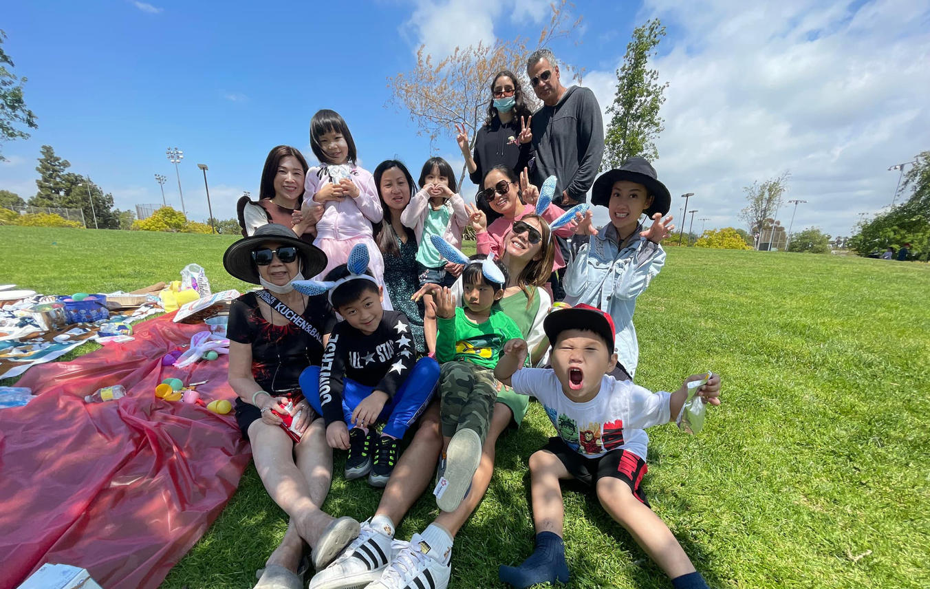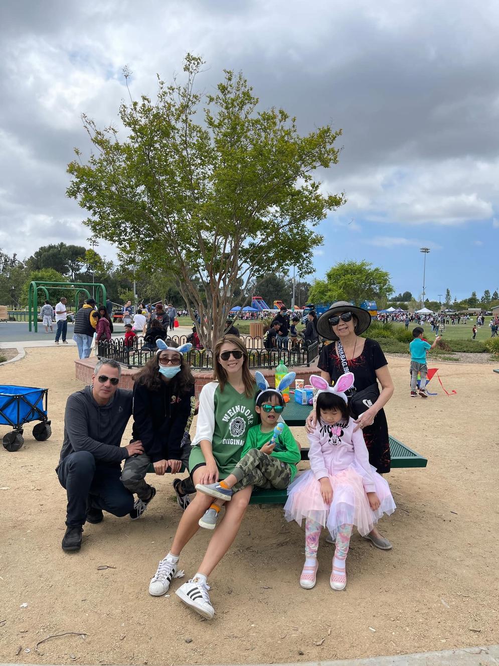Công viên Mile Square thuộc thành phố Fountain Valley, tiểu bang California. Ngọc Quyên cho biết rất nhiều người ở Orange County đã đến đây tham gia các trò chơi theo chủ đề Lễ Phục sinh. Cô và mẹ, con trai cũng dậy sớm chuẩn bị đồ chơi, món ăn vặt cho một ngày cắm trại ở Mile Square. 'Jiraiya rất háo hức vì dịp này có bà ngoại đi cùng', cô cho biết.