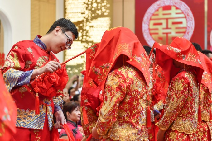 Chú rể vén mạng che mặt cô dâu trong đám cưới truyền thống của 30 cặp vợ chồng tại thành phố Quảng Châu, tỉnh Quảng Đông, Trung Quốc, ngày 11/11/2019. Ảnh: CNS.