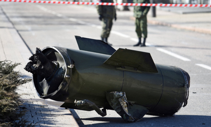 Mảnh tên lửa đạn đạo Tochka-U trên đường phố Donetsk, miền đông Ukraine, hôm 14/3. Ảnh: Reuters.