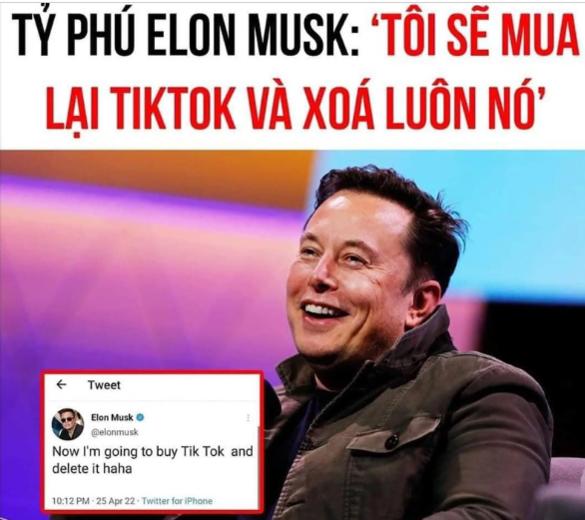 Ngày 28/4, mạng xã hội tại Việt Nam lan truyền bức ảnh chụp màn hình với nội dung về một tweet từ tài khoản chính thức của Elon Musk. “Now I’m going to buy TikTok and delete it haha” (tạm dịch: Tôi đang chuẩn bị mua TikTok và xóa nó haha”. Bức ảnh này được nhiều trang Facebook tại Việt Nam chia sẻ và thu về hàng nghìn tương tác.