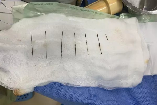 Sau gần 3 giờ phẫu thuật bằng phương pháp mở ngực, các bác sĩ đã lấy 7 cây kim ra khỏi lồng ngực bệnh nhân.