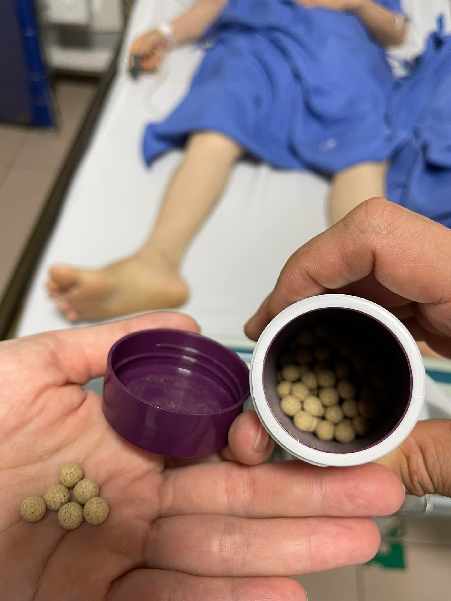 Trước khi nhập viện gần một tháng, bệnh nhân bỏ điều trị, chuyển sang uống thuốc nam khoảng 4 viên một ngày. Viên thuốc có dạng hình cầu màu vàng nâu, đường kính khoảng 1cm, không rõ thông tin về thành phần, hàm lượng, nơi sản xuất và không có chứng nhận cấp phép. Quảng cáo trên bao bì cho biết thuốc có công dụng điều trị tiểu đường và suy thận.