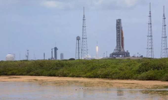 Ở bên phải của bức ảnh là tàu vũ trụ Orion nằm bên trên siêu tên lửa Hệ thống phóng không gian (SLS) trong nhiệm vụ Artemis 1 đến Mặt Trăng của NASA. NASA đang tiến hành thử nghiệm đổ nhiên liệu mang tên "wet dress rehearsal" với tổ hợp Orion - SLS ở bệ phóng 39B của KSC. Tuy nhiên, sau vài trục trặc, các nhà chức trách quyết định chuyển tổ hợp khỏi bệ phóng vào ngày 25/4 để kiểm tra kỹ hơn ở Tòa nhà lắp ráp phương tiện gần đó.