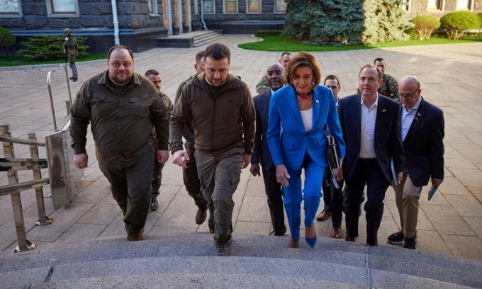 Video được Tổng thống Ukraine Volodymyr Zelensky đăng hôm nay trên Twitter cho thấy ông, được hộ tống bởi đội an ninh có vũ trang mặc trang phục quân đội, chào đón phái đoàn quốc hội Mỹ do Chủ tịch Hạ viện Pelosi dẫn đầu bên ngoài văn phòng tổng thống một ngày trước.