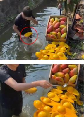 Cụ thể, đoạn clip trông giống như đang vặt xoài từ trên cây xuống. Nhưng khi quả xoài rơi xuống nước và được người đàn ông vớt lên lại chỉ còn có... 1 nửa. Điều đó lập tức khiến người xem nghi ngờ về độ xác thực của clip này. Nhiều người đã để lại các bình luận vạch trần: