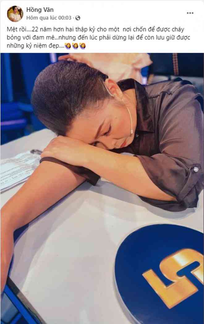 Rạng sáng 2-5, trên trang cá nhân, NSND Hồng Vân bất ngờ đăng tải dòng trạng thái: "Mệt rồi, 22 năm hơn hai thập kỷ cho một nơi chốn để được cháy bỏng với đam mê, nhưng đến lúc phải dừng lại để còn lưu giữ được những kỷ niệm đẹp".