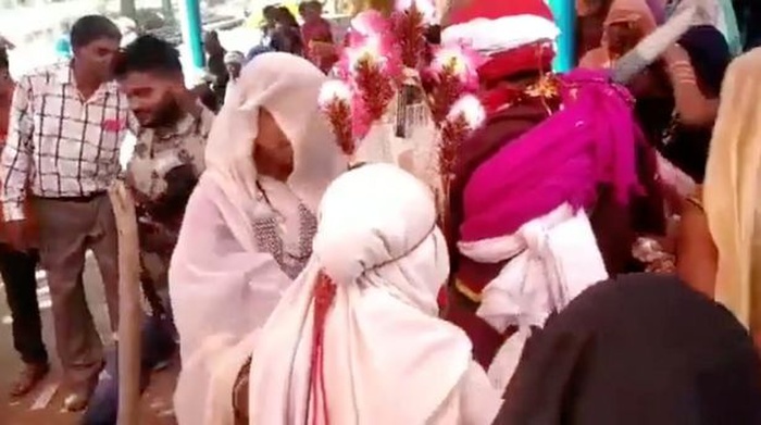 Đám cưới bất thường, diễn ra hôm 1/5 vừa qua khi chú rể đeo mạng che mặt làm lễ kết hôn với 3 cô bạn gái ở Madhya Pradesh, Ấn Độ.