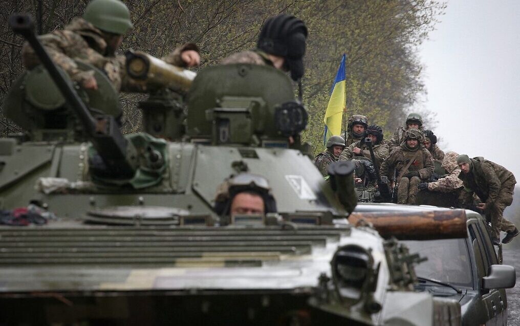 Các binh sĩ Ukraine đứng trên tàu sân bay bọc thép của họ, không xa chiến tuyến với quân đội Nga ở quận Izium, vùng Kharkiv vào ngày 18/4/2022. Ảnh AFP