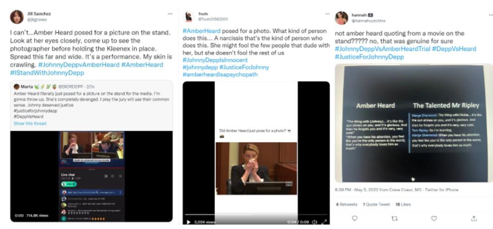 Dòng tweet tương tự xuất hiện nhiều trên mạng xã hội cùng hashtag #amberheardisapsycho path (Amber Heard là kẻ thần kinh), #AmberHeardIsAnAbuse r (Amber Heard là kẻ lạm dụng).