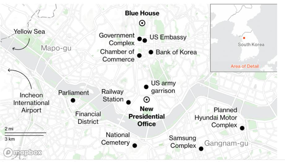 Tổng thống đắc cử của Hàn Quốc muốn chuyển văn pḥng về phía nam, từ Nhà Xanh đến khu vực Yongsan (chấm trắng đen) . Đồ họa: Bloomberg.