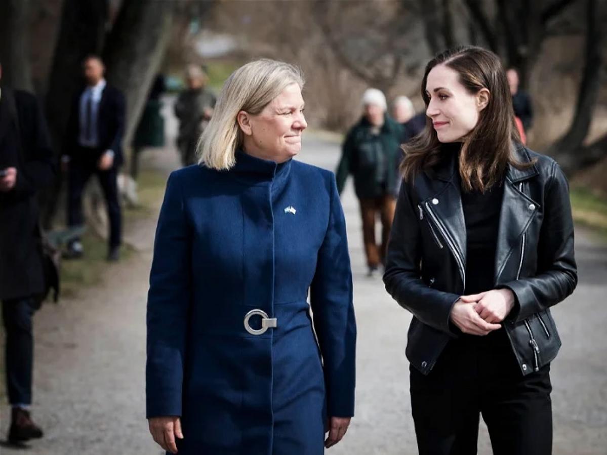 Thủ tướng Thụy Điển Magdalena Andersson (trái) và Thủ tướng Phần Lan Sanna Marin trước cuộc gặp ngày 13/4 tại Stockholm. Ảnh: Guardian