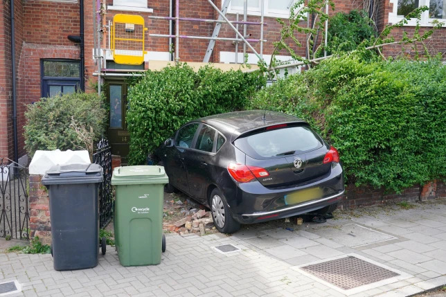 Các mảnh vỡ nằm ngổn ngang trên lối vào nhà sau khi chiếc Vauxhall Astra màu đen lao vào bụi cây. Những người hàng xóm ở Camberwell cho biết vụ va chạm vào khoảng 1h sáng đã gây tiếng động rất lớn.