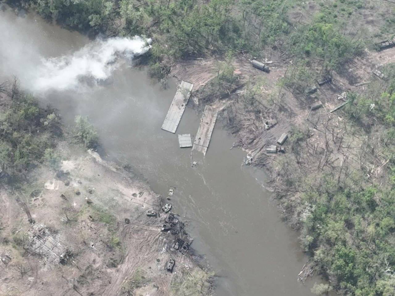 Các hình ảnh từ máy bay không người lái dường như cho thấy một số lượng tương tự các xe tăng và xe bọc thép chở quân đã bị mắc kẹt trong vũng lầy khi cầu phao của họ bị trúng đạn pháo hạng nặng, đổ sập xuống sông.