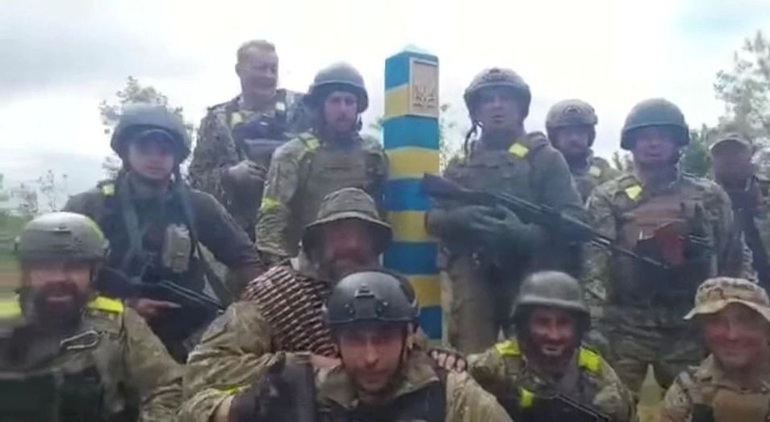 Bộ Quốc pḥng Ukraine cũng công bố một video trên Facebook cho thấy, khoảng 12 binh sĩ thuộc quân đội Ukraine đứng cạnh một cột mốc biên giới với Nga tại Kharkov hôm 15/5. Cột mốc được sơn màu cờ Ukraine.