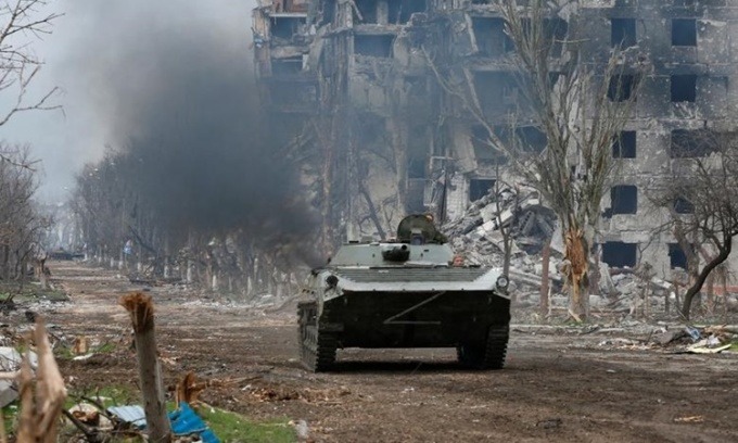 Xe bọc thép thuộc lực lượng thân Nga gần nhà máy Azovstal ở Mariupol ngày 12/4. Ảnh: Reuters.