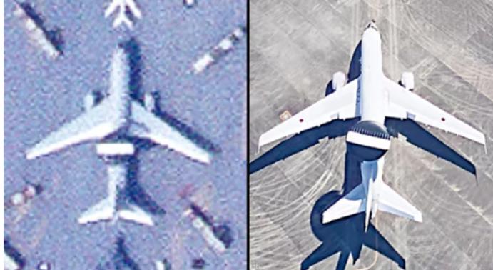 Bên trái là vật thể chụp từ vệ tinh tại Tân Cương, bên phải là chiếc E-767 từ Căn cứ Không quân Hamamatsu ở Nhật Bản. Ảnh: Planet Labs/Google Earth.