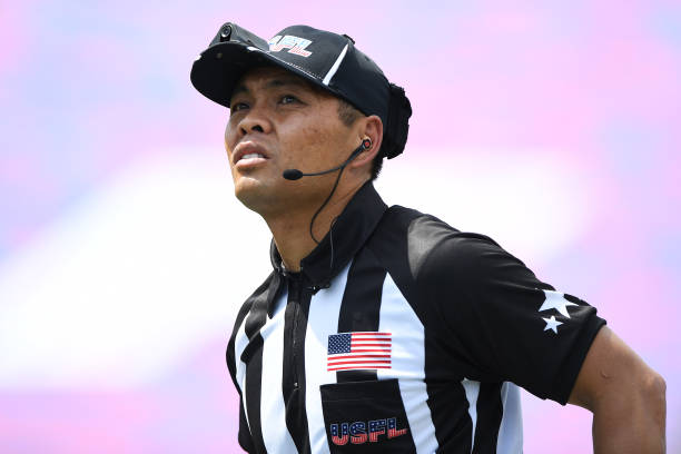 Trọng tài Phạm Văn Lô đang làm việc bên lề sân banh trong hiệp thứ nhất của một trận banh football giữa hai đội hạng B là New Jersey Generals và New Orleans Breakers tại sân Protective Stadium ngày 14 tháng 5, 2022 ở Birmingham, Alabama. (Emilee Chinn/ USFL/ Getty Images)