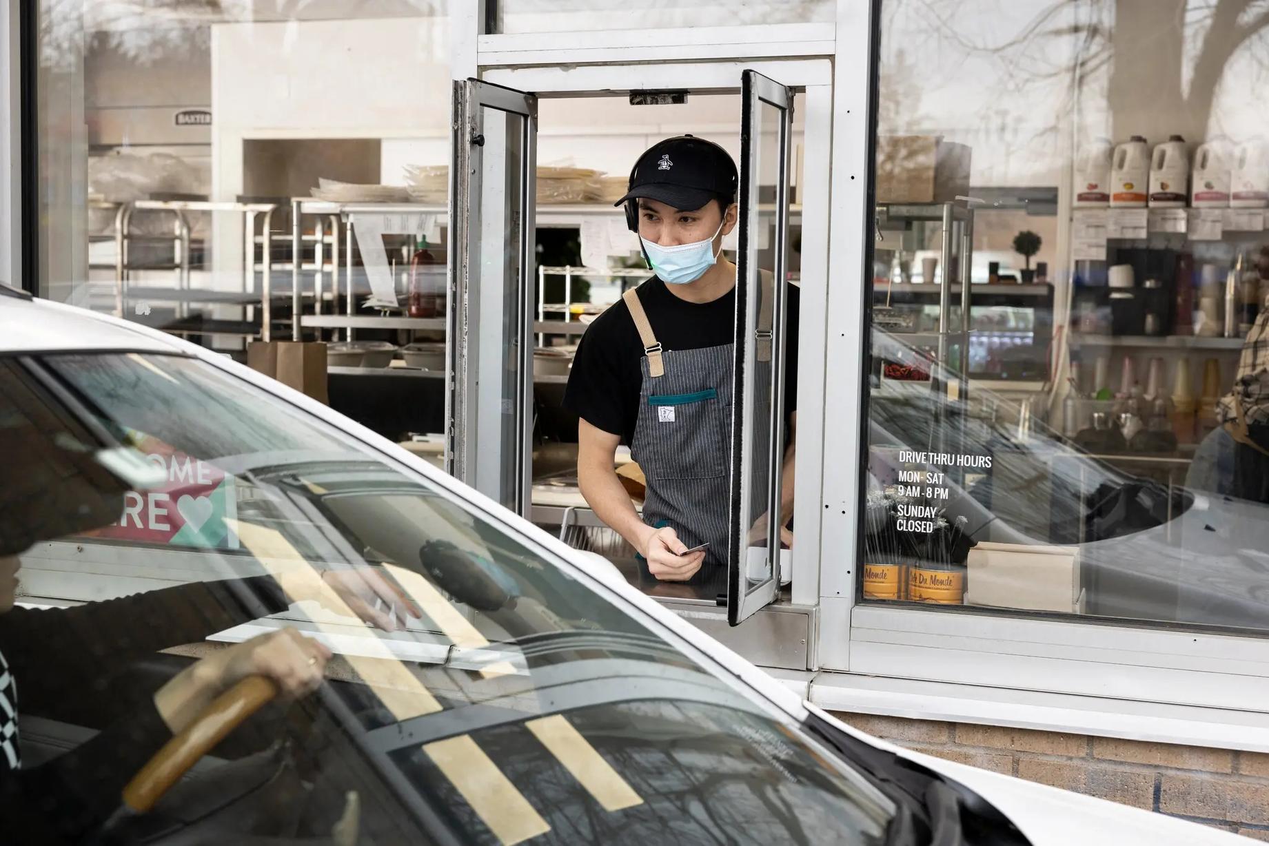 Khách lái ôtô nhận đồ ăn qua cửa sổ tại tiệm Mi-Sant Banh Mi ở Brooklyn Park, Minnesota hồi tháng 4. Ảnh: NY Times