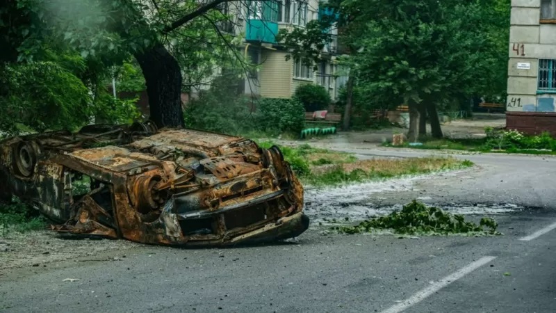 Một chiếc ô tô bị cháy ở thành phố Severodonetsk vào tháng 5 năm 2022