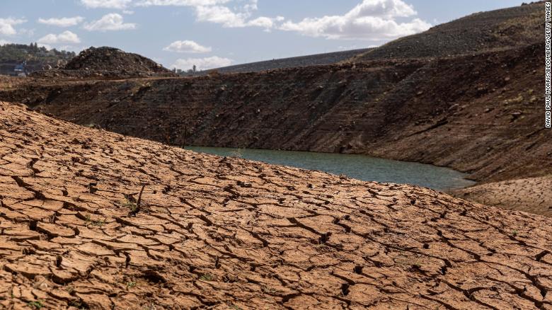 Ḷng hồ Oroville ở California khô nứt vào tháng 10/2021. Ảnh: CNN