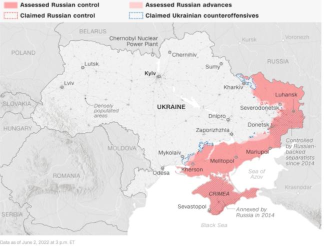 Sơ đồ các vùng của Ukraine mà Nga tuyên bố đă kiểm soát được và đang bao vây. Ảnh CNN