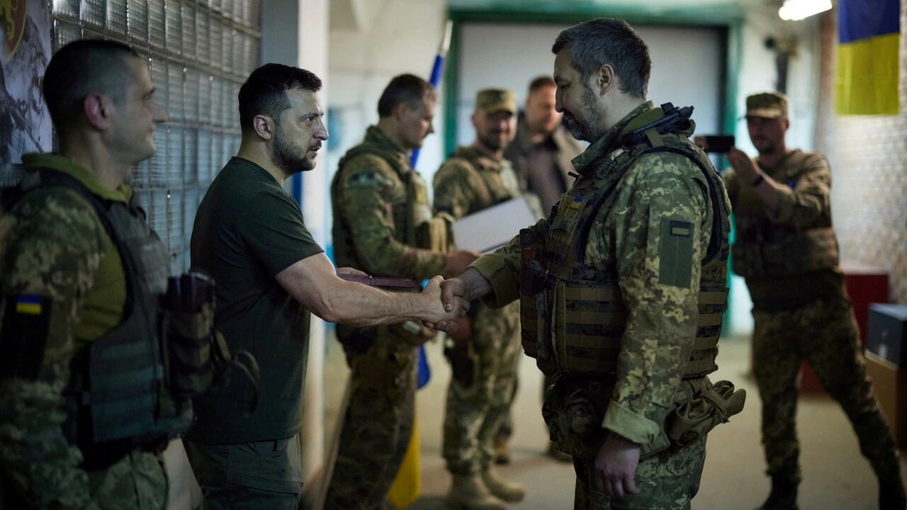 Tổng thống Ukraina Volodymyr Zelensky khen ngợi một binh sĩ, tại Soledar, vùng Donbass, miền đông Ukraina, ngày 05/06/2022. via REUTERS - UKRAINIAN PRESIDENTIAL PRESS SER