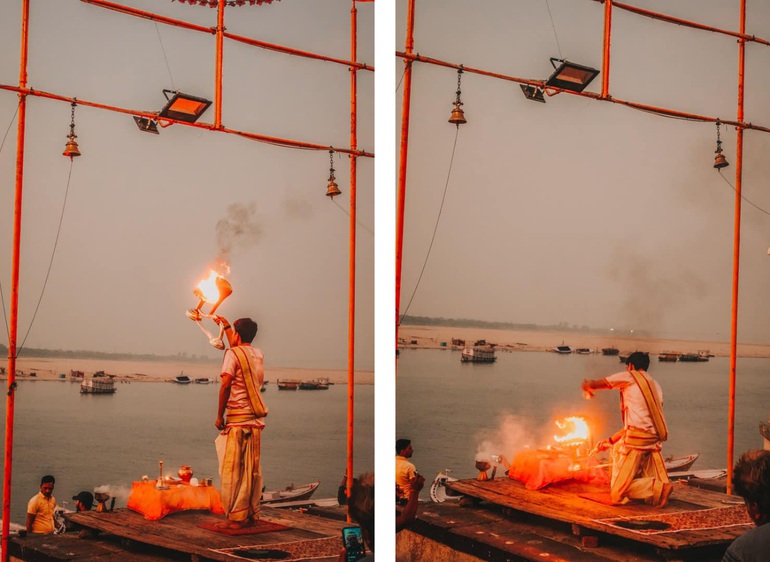 Tục hỏa táng (hỏa thiêu) ở Varanasi diễn ra hàng ngày, hàng giờ và đông đúc nhất vào tầm chiều tối (từ 16h trở đi). Dọc theo sông Hằng, người Ấn Độ dựng 87 ghat (những bậc thang dẫn xuống bờ sông) làm nơi cúng dường và tiến hành nghi lễ.