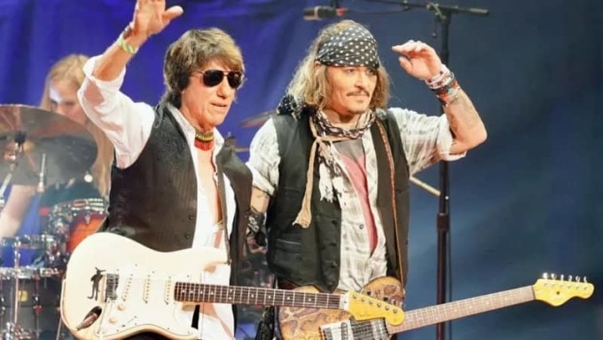 Depp thường xuyên biểu diễn trong các show nhạc của Jeff Beck - tay guitar huyền thoại người Anh. Cuối tuần qua, hai người tổ chức đêm nhạc ở Symphony Hall, Birmingham.