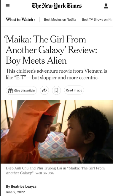 Tuần qua, bộ phim Maika - Cô bé đến từ hành tinh khác ra mắt ở Mỹ với tựa Maika: The Girl From Another Galaxy, đồng thời bước vào tuần chiếu thứ hai ở Việt Nam. Ở Mỹ, sau khi trình chiếu chính thức từ ngày 3/6, bộ phim nhận được sự quan tâm của nhiều khán giả cùng những cây bút trong giới điện ảnh, trong đó có tờ New York Times.