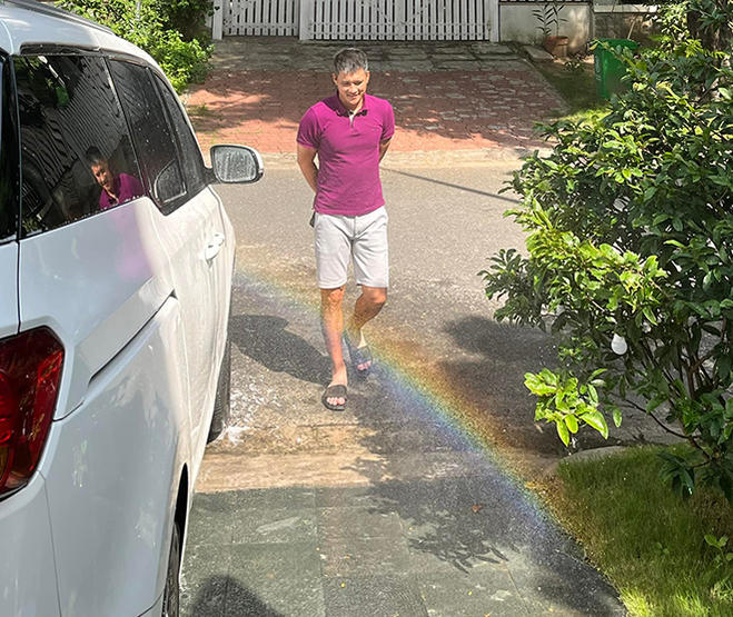 Trên trang cá nhân, Công Vinh thu hút sự chú ý của người hâm mộ khi đăng tải bức ảnh dạo bước trước cổng nhà. Cựu cầu thủ quê Nghệ An mặc áo thun quần đùi đơn giản, mỉm cười khi nhìn thấy cầu vồng. Anh hào hứng đính kèm dòng chú thích: “Anh và cầu vồng”.