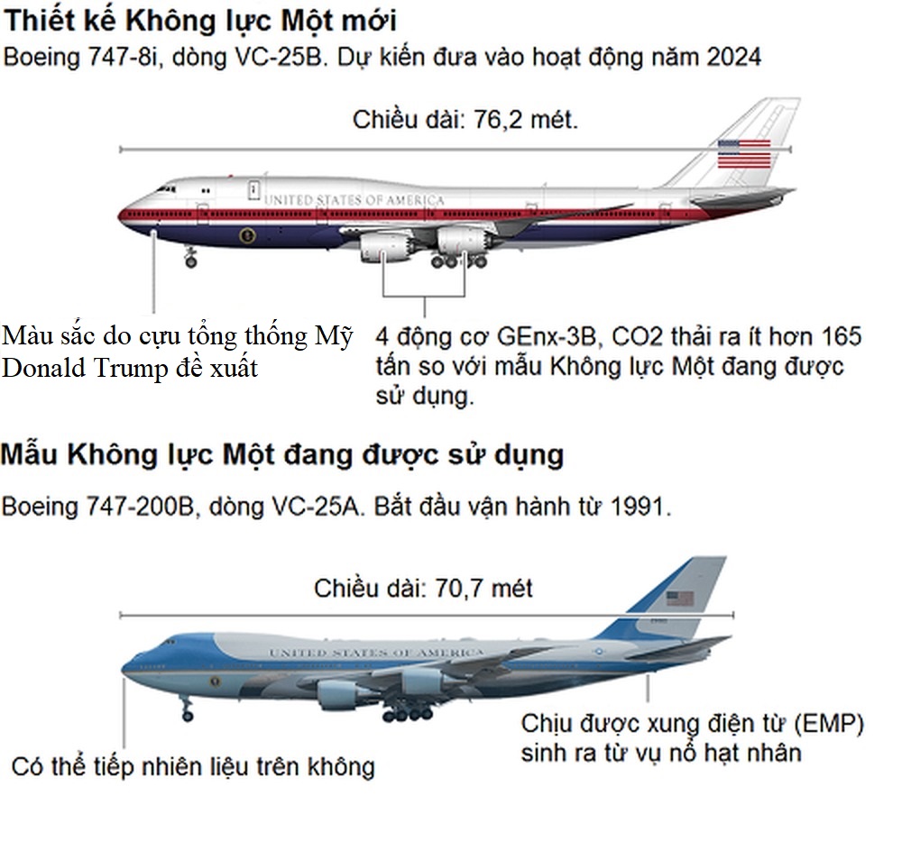 So sánh hai mẫu thiết kế chuyên cơ Không lực Một. Đồ họa: BBC.