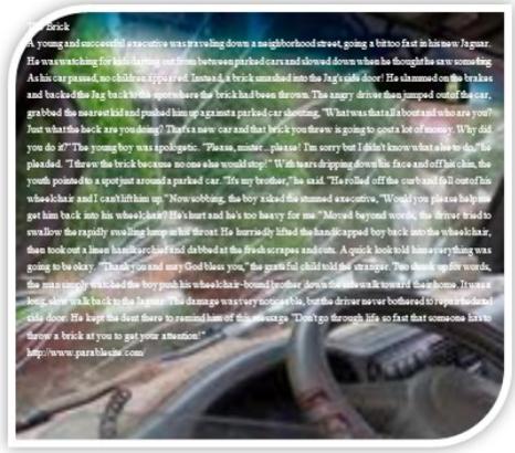 Quãng đường quay trở lại xe thật là dài. Chiếc xe bị hư hại khá nặng, nhưng anh cũng chẳng buồn đi sửa tấm kính bên hông vừa bị ném vỡ nát. Anh cứ để nguyên chỗ vỡ như thế để nhắc nhở với mình rằng: “Trong cuộc đời, đừng bao giờ đi quá nhanh để rồi có một ai đó buộc phải ném cục gạch để thức tỉnh mình!”
