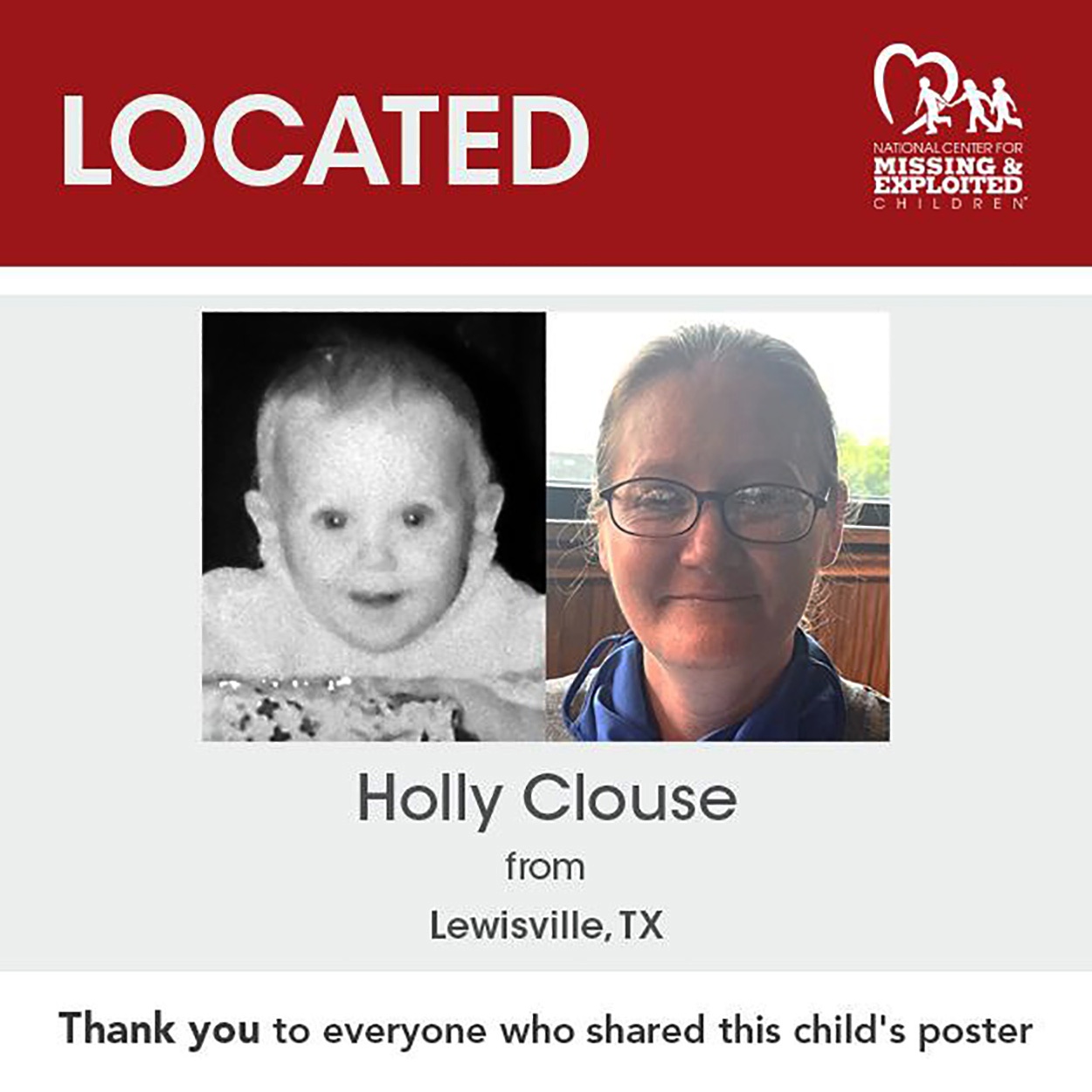 Theo như vào hôm thứ Tư, văn phòng Bộ Trưởng Tư Pháp Texas ông Ken Paxton cho biết em bé mất tích hơn 40 năm là bà Clouse, nay 42 tuổi, đã được tìm thấy, còn sống và khỏe mạnh. Bà Holly Clouse đã có con và cháu nội-ngoại, đang sống ở tiểu bang Oklahoma, sau khi Holly Clouse mất tích khi còn là em bé sau khi cha mẹ bị sát hại trong một khu rừng rậm ở Houston cuối năm 1980, xác được khám phá năm 1981.