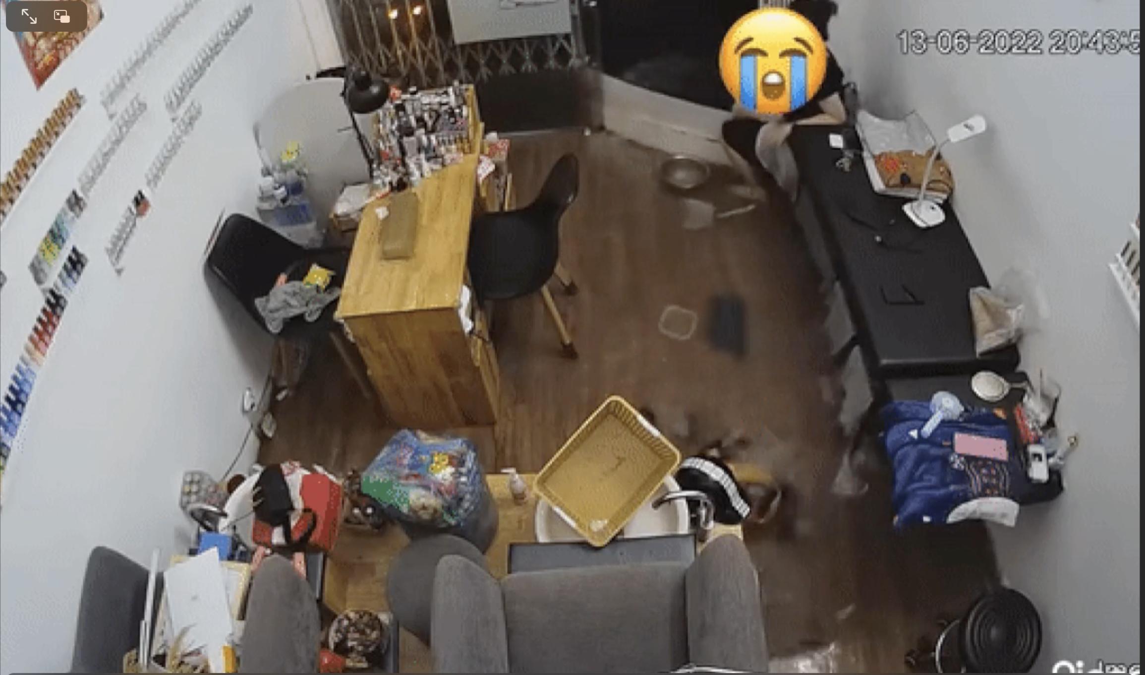 Nhìn cảnh tưởng trước mặt, nước mưa lênh láng, đồ đạc trôi lung tung, nữ chủ tiệm ngồi thừ người nhìn bất lực. Toàn bộ cảnh tượng đã được camera an ninh trong tiệm ghi lại.
