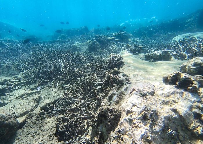 Đáy biển phủ một màu xám xịt. San hô chết gây ảnh hưởng nghiêm trọng đến hệ sinh thái nơi này. Nhiều loài thủy sản đã rời đi nơi khác trú ngụ.