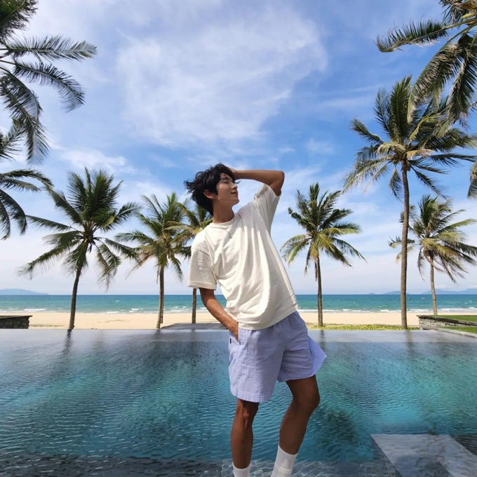 Trên trang cá nhân ngày 16/6, diễn viên 40 tuổi đăng video đạp xe trong một khu nghỉ dưỡng gần bãi biển Hà My. Anh còn khoe loạt ảnh ngắm biển, tận hưởng ẩm thực địa phương.