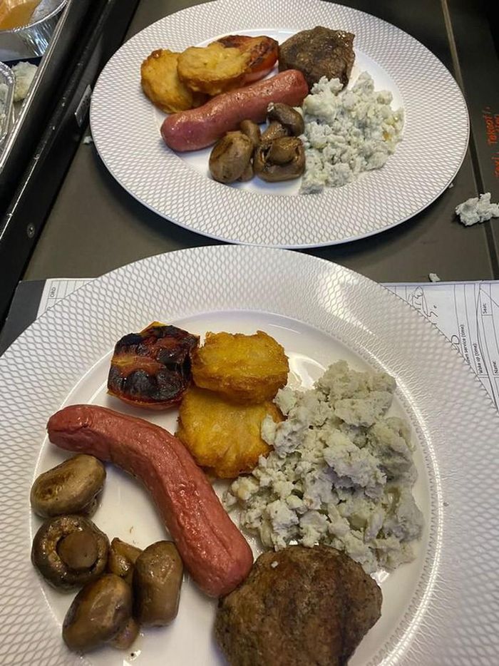 Cụ thể, trong suất ăn của hãng bay tiêu chuẩn 5 sao có vài món khác nhau gồm một miếng thịt băm có màu nâu cháy, bốn cây nấm, một chiếc xúc xích kỳ lạ và hai món khó xác định.