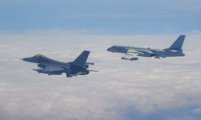 Tiêm kích Đài Loan (trái) bám theo oanh tạc cơ Trung Quốc hồi tháng 2/2020. Ảnh: Lực lượng phòng vệ Đài Loan.