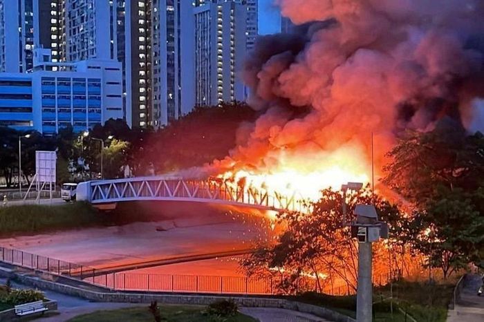 Theo Reuters, đám cháy bùng phát lúc 19h ngày 21/6 trên một cây cầu dẫn cáp điện ở quận Yuen Long (phía Bắc Hồng Kông, Trung Quốc).