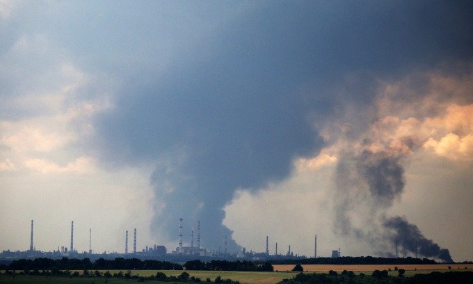 Khói bốc lên từ nhà máy lọc dầu ở ngoại ô Lysychansk, miền đông Ukraine, hôm 23/6. Ảnh: AFP.