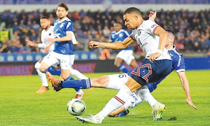 PSG của Mbappe (áo trắng) bị Strasbourg cầm hoà 3-3 ở Ligue 1 mùa vừa qua. Ảnh: AFP