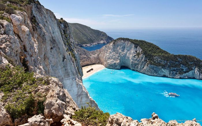 Vịnh Navagio, còn được gọi là Shipwreck Cove tại Hy Lạp là bãi biển cô lập trên hòn đảo Zakynthos, nằm ở phía tây của đảo Ionian, gần làng Anafotiria. Nơi đây nổi tiếng với những vách đá vôi hùng vĩ bao quanh bãi biển cát trắng và nước trong xanh, thu hút du khách trên toàn thế giới đến chiêm ngưỡng. Ảnh: wallpaperflare.