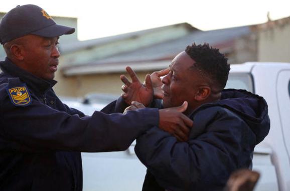 Người thân của nạn nhân phản ứng với một sĩ quan cảnh sát khi nhân viên pháp y đang điều tra cái chết của những người khách quen được tìm thấy bên trong Quán rượu Enyobeni ở TP.Đông London, Nam Phi, ngày 26/6. Ảnh Reuters.