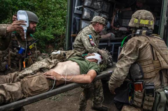 Một binh sĩ của đơn vị đổ bộ đường không Ukraine bị thương nặng được sơ tán sau khi bị trúng bom Nga vào ngày 26/6. Ảnh Washington Post.